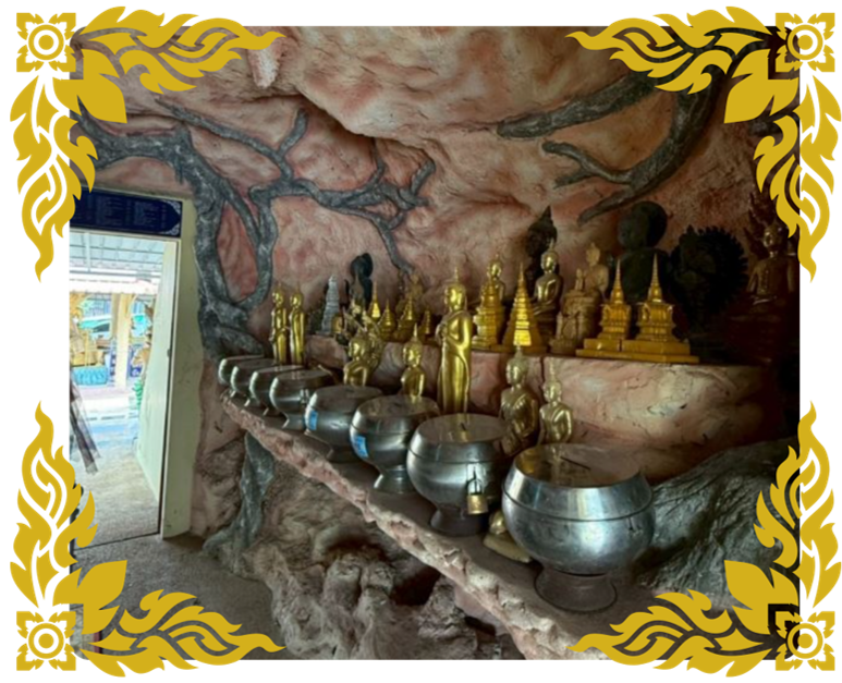 ภายในถ้ำจำลองที่จัดสร้างไว้อย่างสวยงามมีพระพุทธรูปหลายองค์ประดิษฐานเรียงรายอยู่ร่วมกับบาตรพระ เป็นพื้นที่ที่ชาวพุทธสามารถเข้ามากราบไหว้ ทำบุญ ใส่เหรียญบาตรตามความเชื่อ เพื่อเสริมบุญบารมีให้ครบถ้วนทั้ง 108 ประการสถานที่นี้จึงไม่ใช่เพียงสถานที่ทางศิลปกรรมแต่ยังมีความหมายเชิงธรรมะและเป็นที่รวมของกิจกรรมสร้างบุญของญาติโยม ที่มาวัดเป็นหนึ่งในจุดสำคัญที่สะท้อนพุทธศิลป์และการปฏิบัติธรรมอย่างแท้จริง