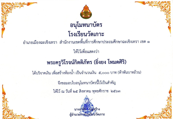 | ชื่อผลงาน : พระครูวิโรจน์กิตติภัทรได้บริจาคเงินเพื่อสร้างห้องน้ำให้โรงเรียนวัดเกาะ | |