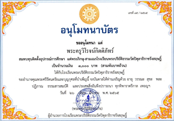 | ชื่อผลงาน : พระครูวิโรจน์กิตติภทร์ สมทบทุนติดตั้งอุปกรณ์การศึกษา แด่พระภิกษุ | |
