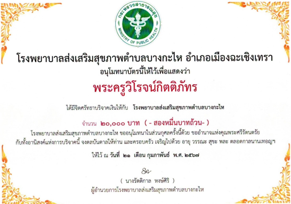 | ชื่อผลงาน : บริจาคเงิน ให้กับ โรงพยาบาลส่งเสริมสุขภาพตำบลบางกะไห | |