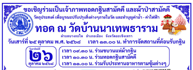 เชิญร่วมเป็นเจ้าภาพทอดกฐินสามัคคี ณ วัดบ้านนาเทพธาราม จังหวัดฉะเชิงเทรา